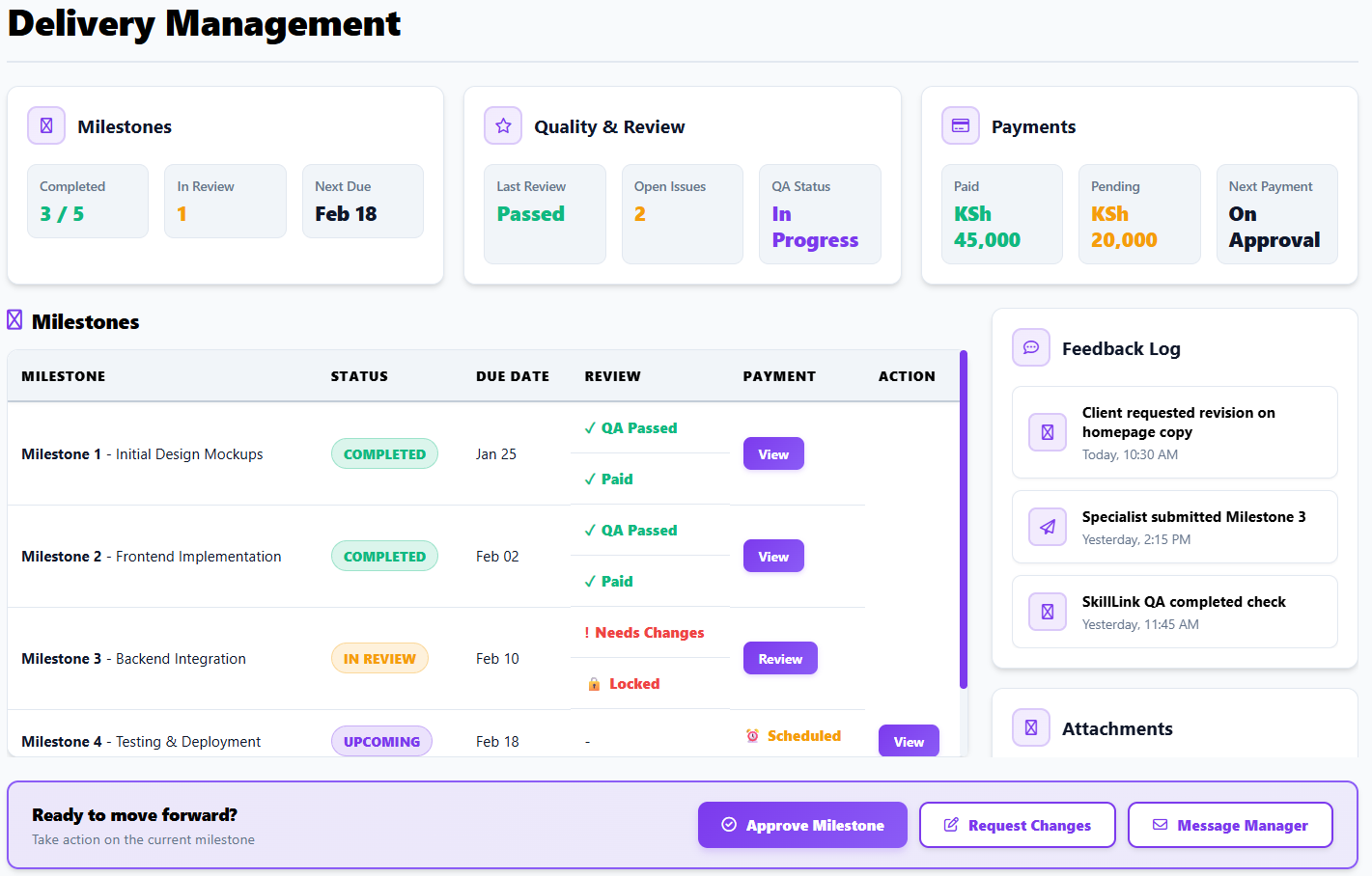 Milestones are reviewed, feedback is logged, and payments are tracked end-to-end.